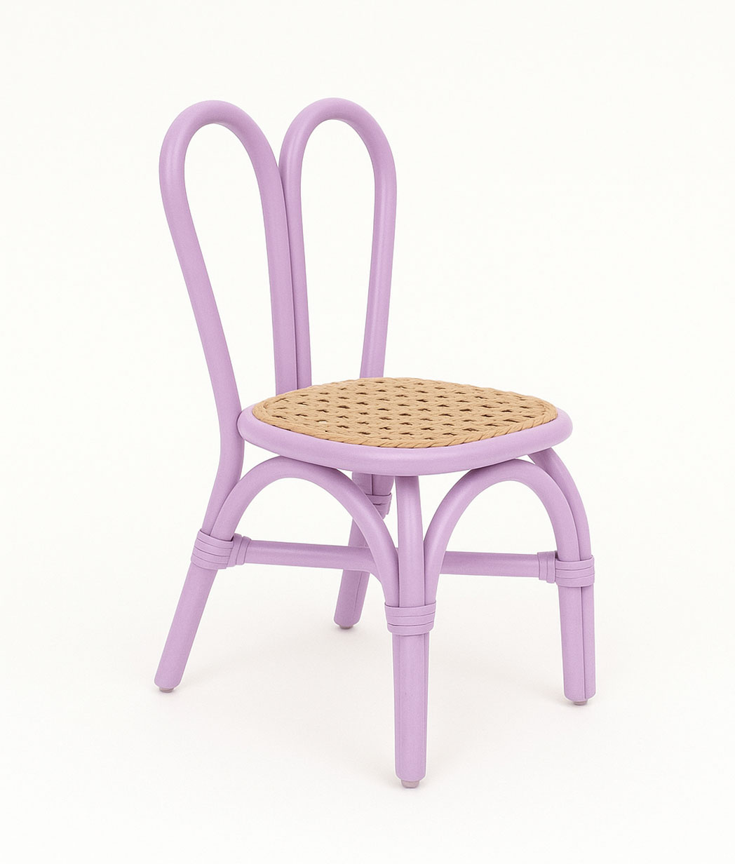 Handcrafted kids rattan chair with charming bunny-ear backrest and a breathable Thai water grass seat. Available in soft mint green, pastel pink, and lilac purple—perfect for Montessori spaces, playrooms, or nursery decor.